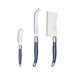 • A 3pc cheese serving set with blue ABS handles and stainless rivets. Includes a cleaver, spreader and pronged cheese knife.